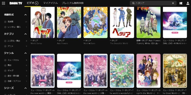 ヘタリアの各アニメ作品はDMM TVで見れて、同作品のミュージカルも視聴できます。