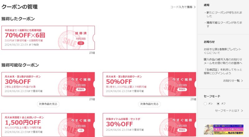 ebook は豊富なクーポンと曜日による割引が魅力ですが、各クーポンには『有効期限』があるので、いつまで使えるかチェックしておきましょう。